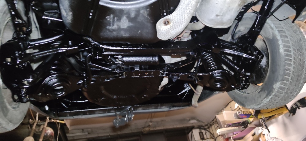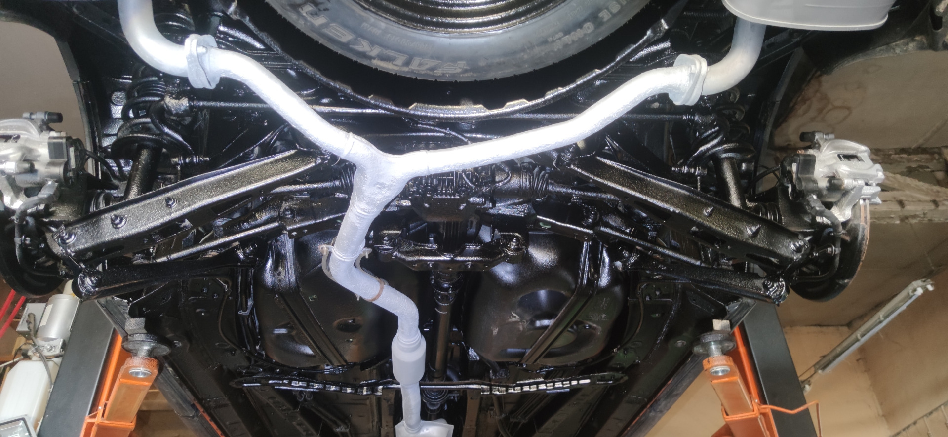 Následuje samotný nástřik antikorozní barvou na bázi modifikovaných asfaltů od české značky Detecha-Tlumex plast plus